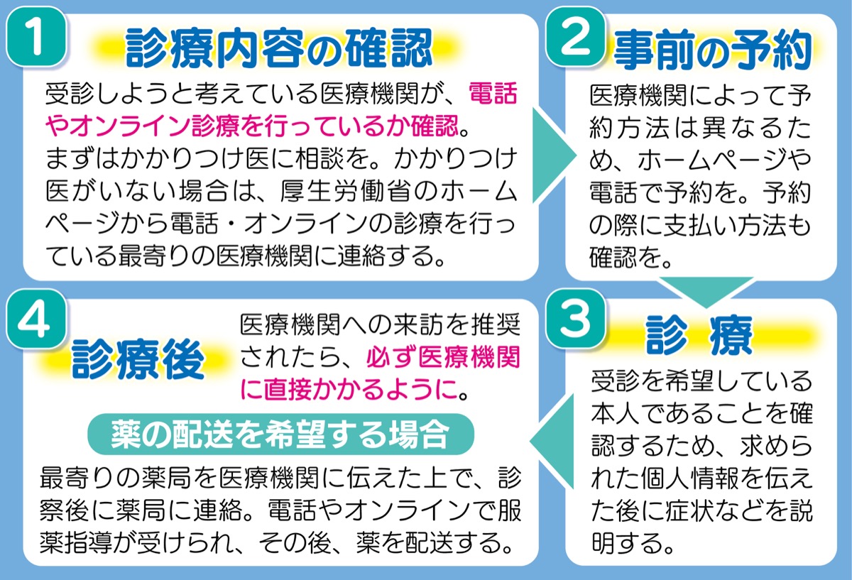 診療を希望する人は、受診しようと考えている医療機関のホームページ、または直接医療機関に電話やオンラインの診療を実施しているかを確認。事前に予約を行う。支払い方法等は各施設に確認する。