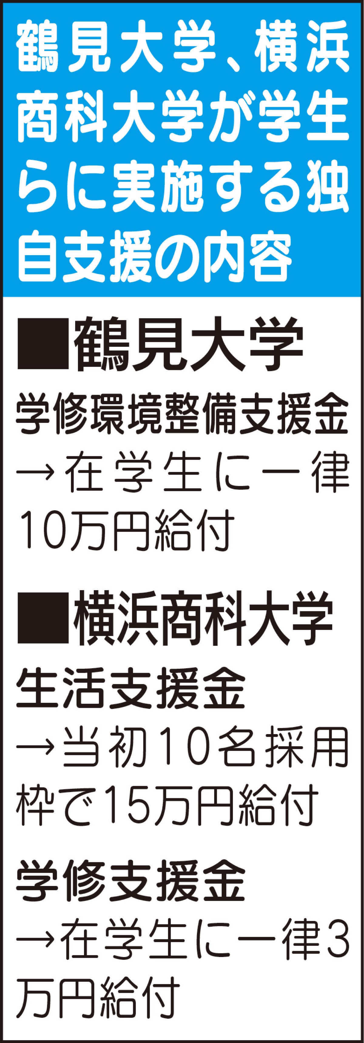 新型コロナウイルスの影響でアルバイト収入が減り、生活に困窮する学生の支援などを目的に、全国の大学で独自の給付が広がっている。鶴見区内にキャンパスをかまえる鶴見大学と横浜商科大学も、このほど学生に向けた給付制度を発表。在学生の学習機会や生活を支える。