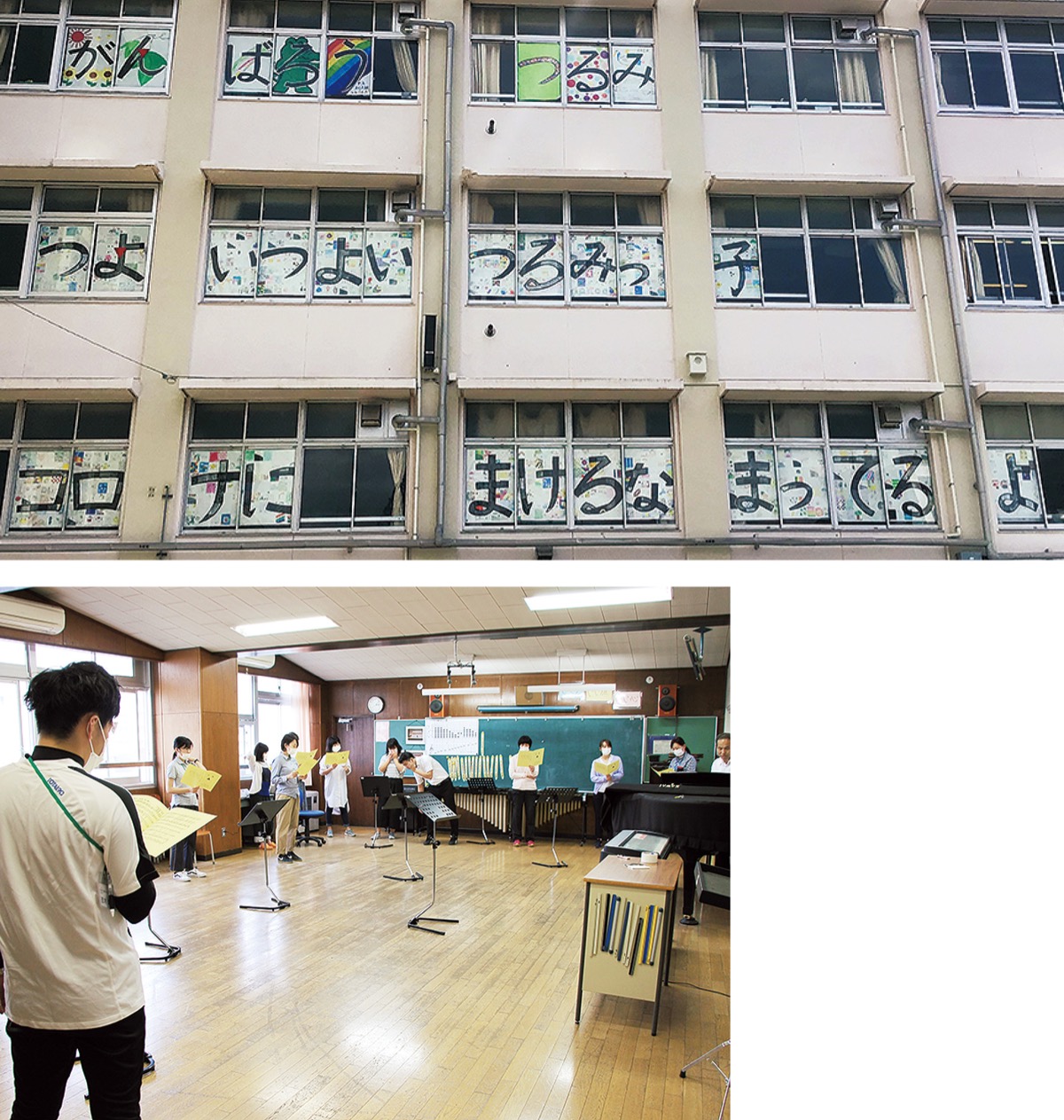 掲示されたのは窓枠1枚分の模造紙32枚で作られた「がんばろうつるみ つよい つよい つるみっ子 コロナに まけるな まってるよ」という言葉。学校の外からも見えるA棟校舎の教室窓に飾られている。