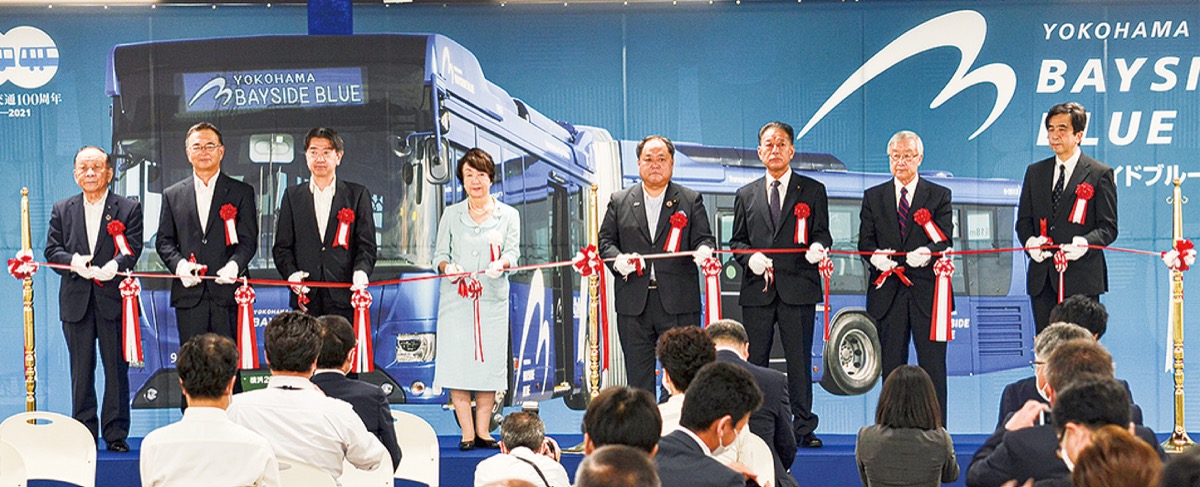 横浜ハンマーヘッドCIQホールで行われた記念式典には、林文子市長や横山正人横浜市会議長など関係者約180人が出席。あいさつに立った林市長は「BAYSIDE BLUEは、横浜駅周辺、みなとみらい21地区、中華街、元町など多彩で魅力あるエリアをつなぐ交通の軸となる。輸送や移動手段ではなく、移動中ワクワクする乗り物として多くの人に愛されるバスになってほしい」と話した。式典では、代表者によるテープカットも行われ、運行を祝った。