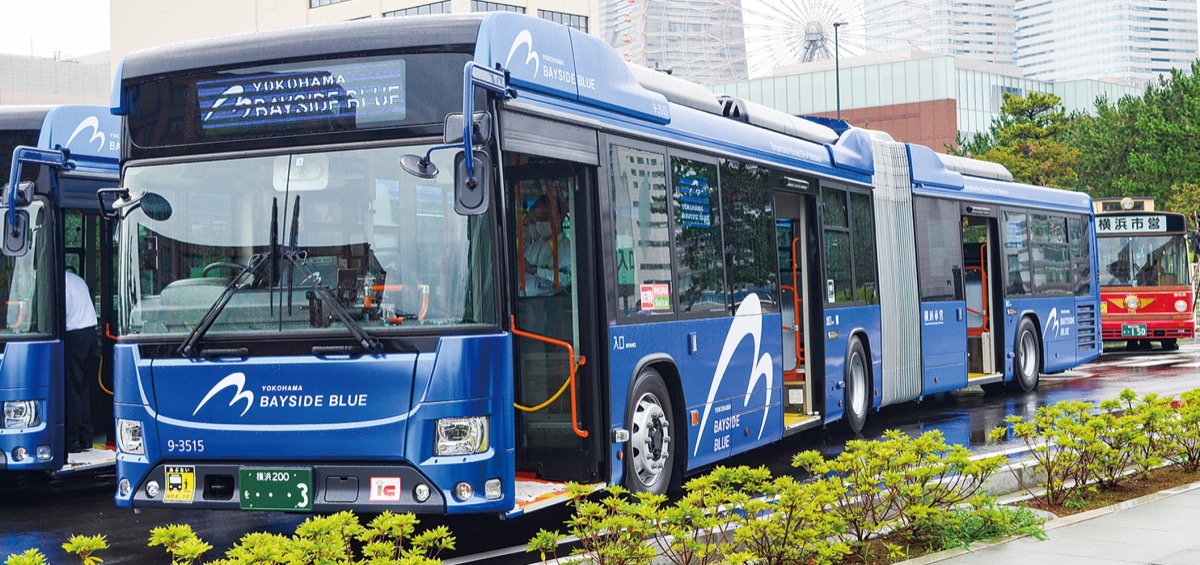 横浜市交通局が運行するBAYSIDE BLUEは、連節バスとしては初の国産車。全長は約18mで定員113人。横浜駅東口から山下ふ頭までの水際線沿いを運行。約6Kmの距離を40分前後で走る。今回、4台導入された。