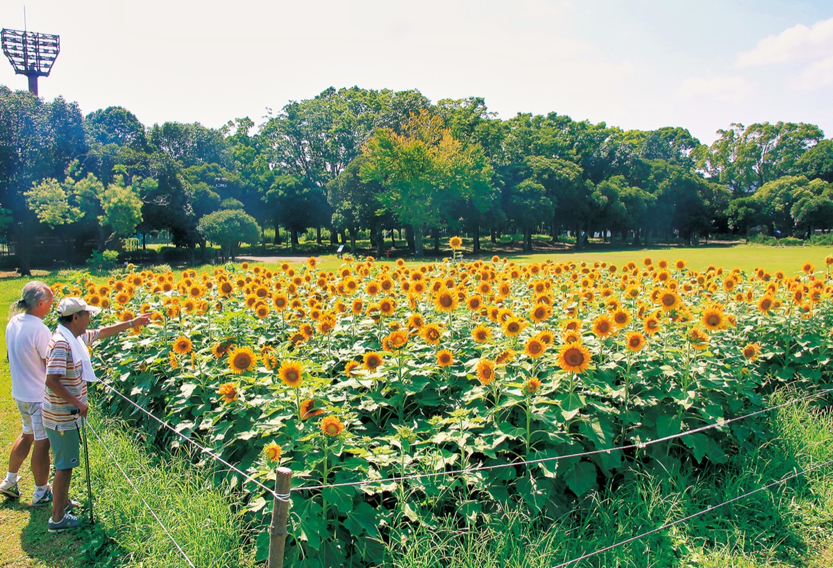 同園の北口付近には、今年新たに約200株のひまわりが育っている。