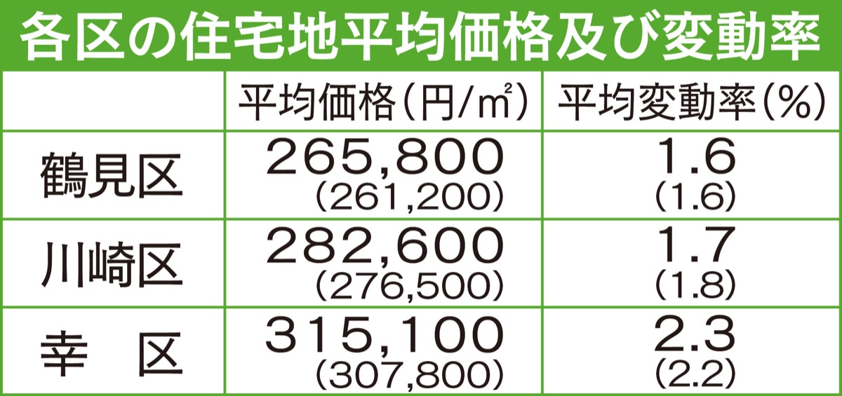 神奈川県が3月に発表した、適正な土地取引価格の指標となる「地価公示価格」(1月1日時点)によると、川崎区、幸区、鶴見区とも都心へのアクセスの良さなどを背景に、ほぼ全ての地域で上昇している。