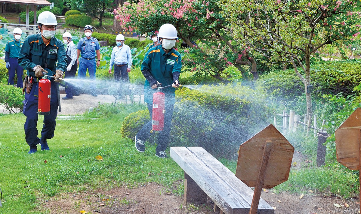 馬場花木園と鶴見消防団第8分団による消防訓練が、9月5日、同園であった。消防団を交えた形での訓練は同園では初めて。