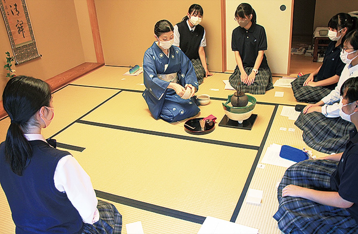 白鵬女子高等学校には国際コースの生徒が受講できる独自の教科「国際教養」がある。この教科は世界で活躍する人材育成を目指し、英語でのプレゼンテーションや日本文化の発信など、レベルの高い学びを実践している。9月2日に行われた1年生の国際教養の授業では(一社)茶道裏千家淡交会総本部の国際部に所属し、5年ほど前から教える平美恵子(宗美)さんが同校に併設する作法室で茶道の心からマナーまでを英語で教えた。