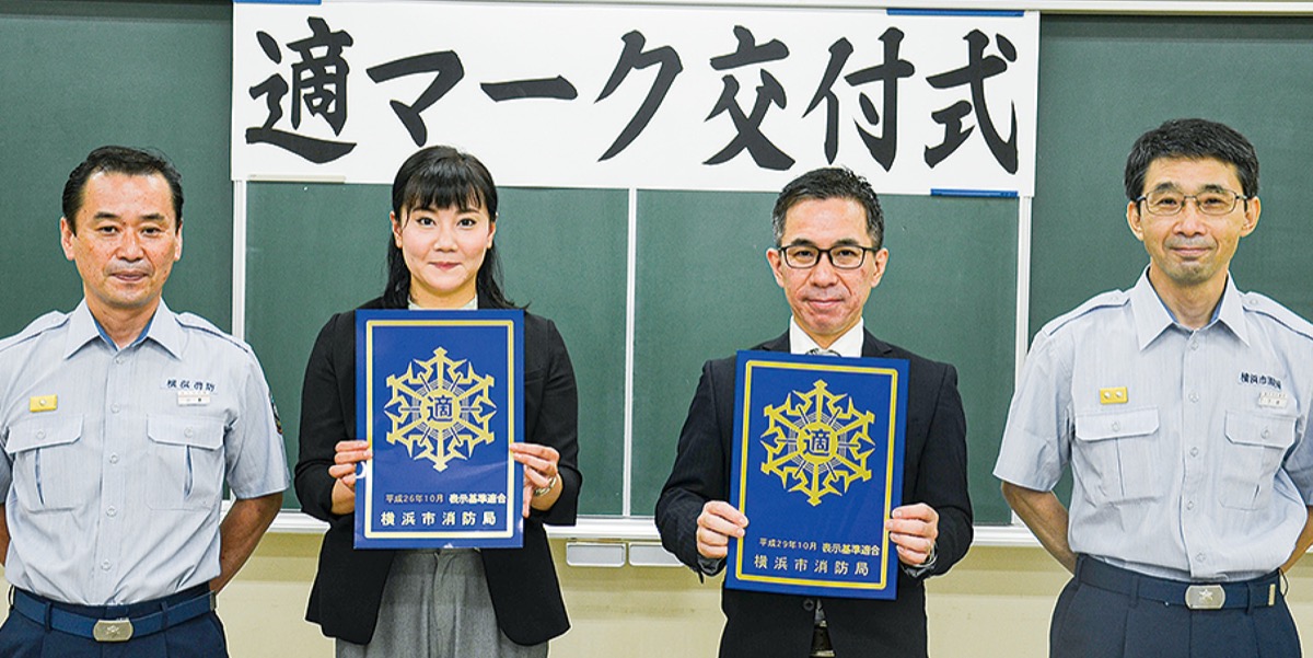 防火基準などに適合しているホテル・旅館等に交付される「適マーク」の交付式が9月23日、鶴見消防署で行われた。いずれも鶴見中央にある東横イン横浜鶴見駅東口と、ホテルメッツ横浜鶴見に交付された。