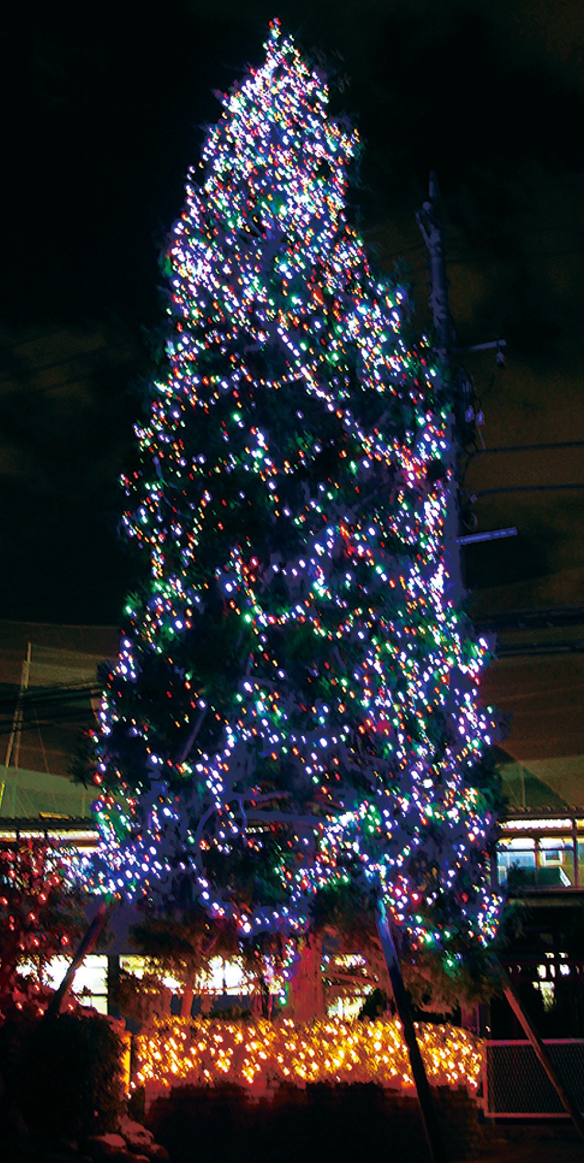 ビッグゴルフ滝川(滝川聡代表取締役)=上の宮=の駐車場に毎年設置されている区内最大級のクリスマスツリーが点灯を始めた。しかし、この灯りが見られるのは最後かもしれない。