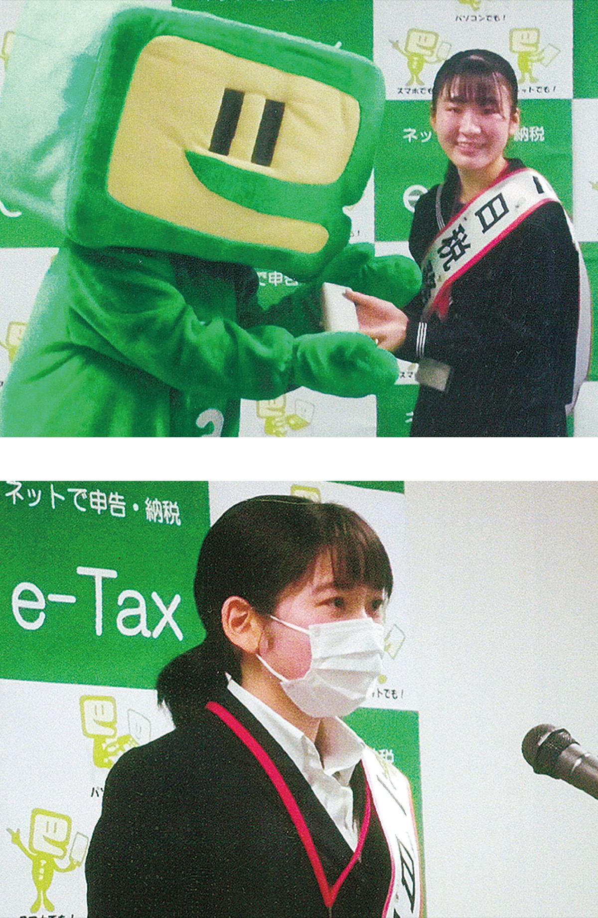体験した藤さんは「緊張したが、皆さんが笑顔で楽しかった」とコメント。井田さんは「税務署の仕事は難しそうと思っていた。税金を身近に感じた」と話した。