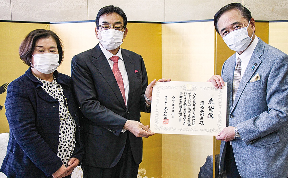 本社を馬場に構え、物流など7社を経営する篠原グループの代表取締役会長・篠原今朝男さんが神奈川県の設置する「まなびや基金」に100万円の寄付を行い、3月10日、黒岩祐治神奈川県知事から表彰を受けた。