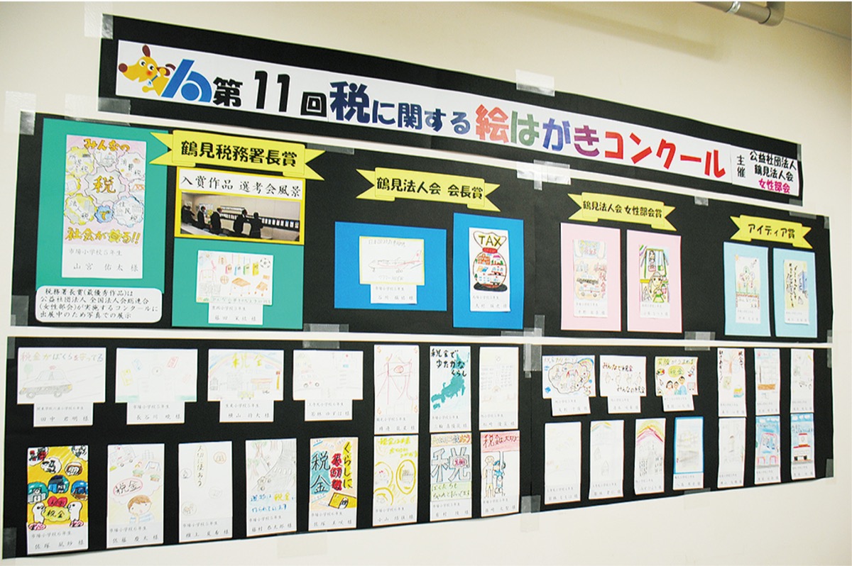 (公社)鶴見法人会女性部会による「税に関する絵はがきコンクール」の入賞作品などが、鶴見税務署の2階に展示されている=写真。