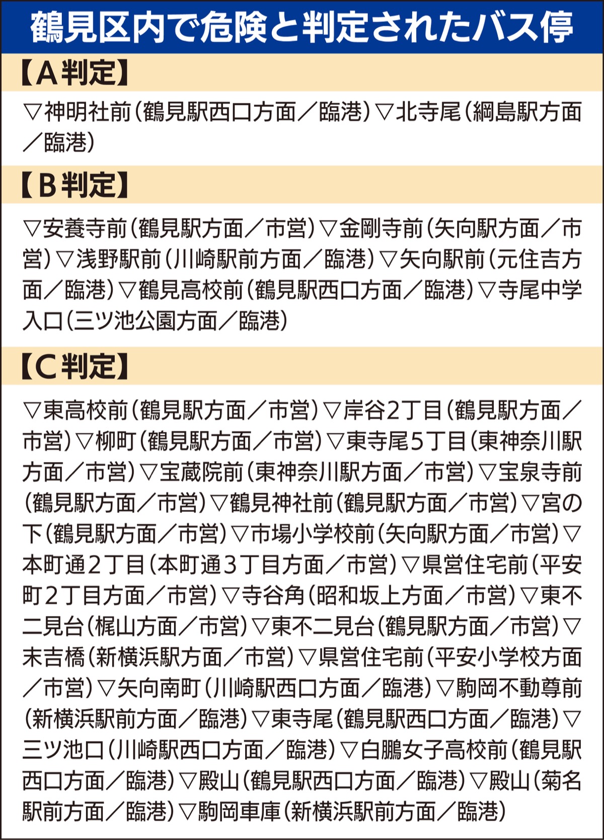 鶴見区内でA判定(過去3年以内に停車したバスが要因となる人身事故が発生、または停車時に横断歩道に車体がかかる)となったのは、いずれも川崎鶴見臨港バスの「神明社前」(鶴見駅西口方面)と「北寺尾」(綱島駅方面)の2カ所だった。