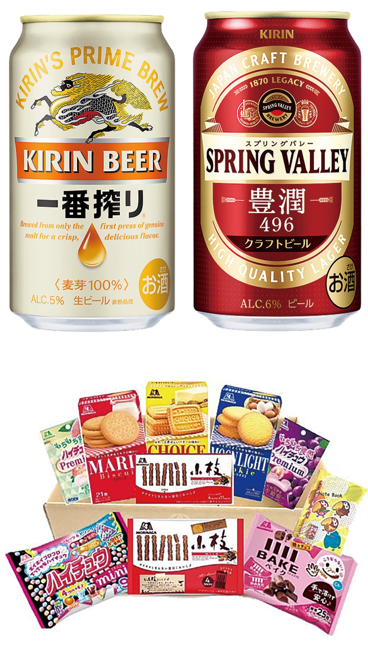 今回追加されたのは、キリンビール(株)横浜工場から、「一番搾り」350ml1ケース(24本)と「SPRING VALLEY豊潤〈496〉350mlケース(24本)の2商品。森永製菓(株)鶴見工場からは、同工場生産の「ハイチュウ」や「小枝」といった人気商品9種類をセットにしたもの。