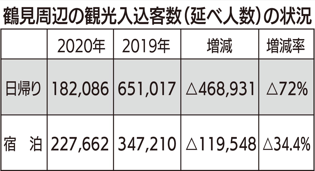 エリア別内訳で鶴見周辺は、大本山總持寺やふれーゆ、大黒海釣り施設、キリンビール横浜工場などから日帰り客数を計算。対象施設のほとんどが休館や来場者の受入を制限した関係から、20年は18万2086人で19年比72%減となった。一方、鶴見駅前のビジネスホテルなど、約10施設から聞き取りを行っているという宿泊客数は、20年が22万7662人で同比34・4%減だった。