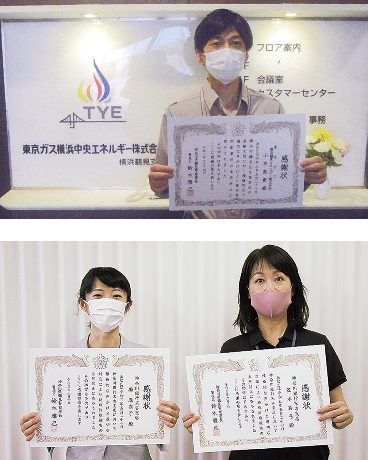 鶴見警察署はこのほど、特殊詐欺を未然に防いだとして東京ガス横浜中央エネルギー(株)横浜鶴見支社と神奈川銀行末吉支店に感謝状を贈った。