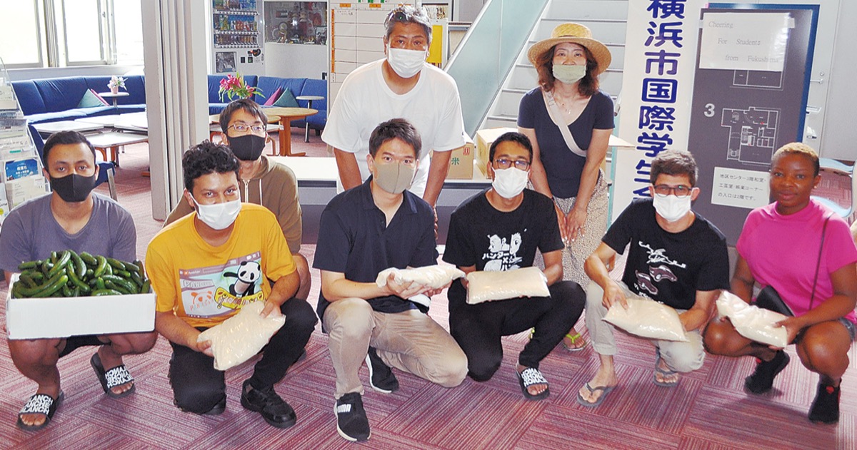 鶴見区の友好交流都市の一つ、福島県西会津町で農業などを営む仲川久人さんを中心とした有志らが、7月31日、区内本町通の横浜市国際学生会館の留学生らに、米ときゅうりを寄付した。