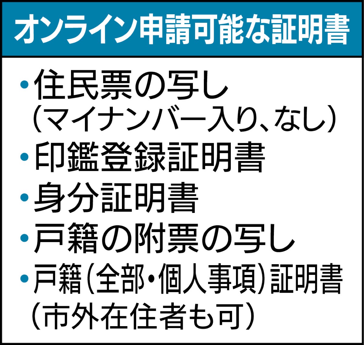 マイナンバーカードによりネット上での本人確認が可能になったことで導入されたサービスで、これに先駆けて17年1月にコンビニ交付が始まっている。オンライン申請では、市外在住者も戸籍証明書取得が可能になるなど、申請できる証明書の種類がコンビニ交付よりも増えたほか、24時間場所を問わず申請ができるようになった。