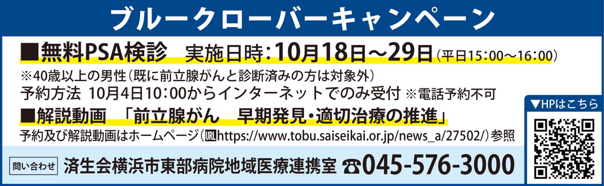 済生会横浜市東部病院=鶴見区下末吉=で10月4日から29日まで、「前立腺がん」の早期発見・治療を目的とする普及啓発企画ブルークローバーキャンペーンが行われている。18日からは無料のPSA検診(要予約)もある。