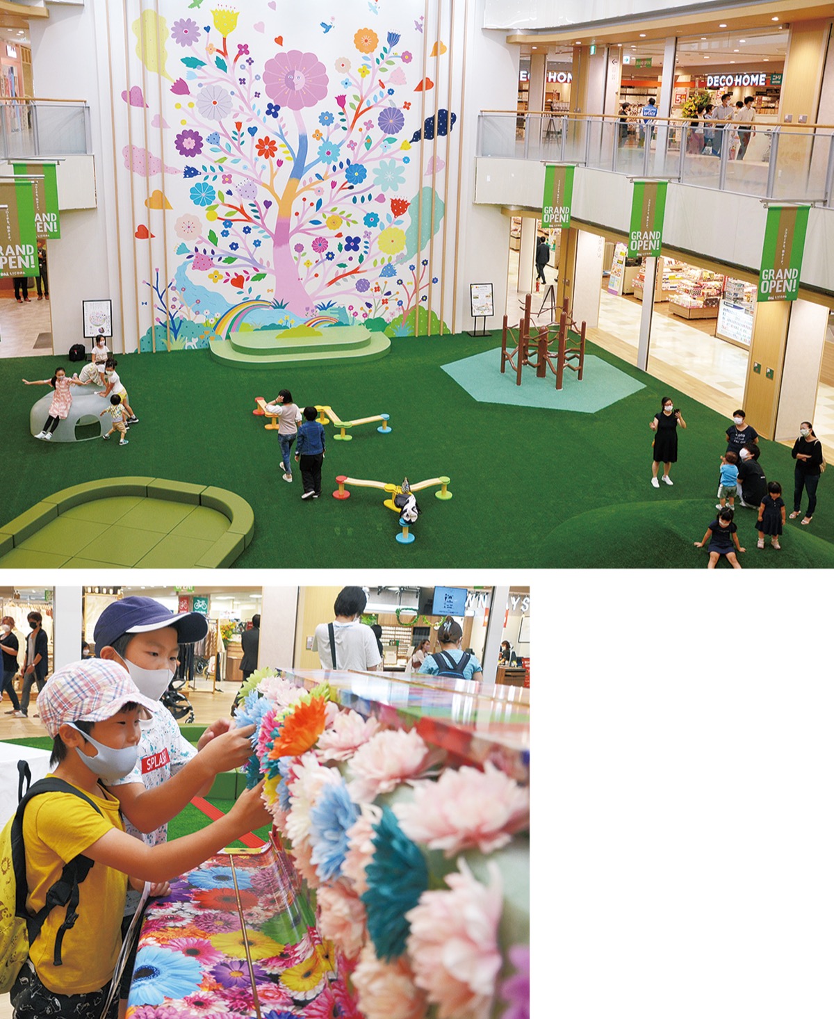 子育て世代も対象とし、90坪ほどある吹き抜けの中央部分には「PARK」と呼ばれる人工芝の公園を整備。室内遊具やピアノも設置した。訪れていた親子連れは、「雨の日でも遊べて安心できる。活用したい」と笑顔だった。
