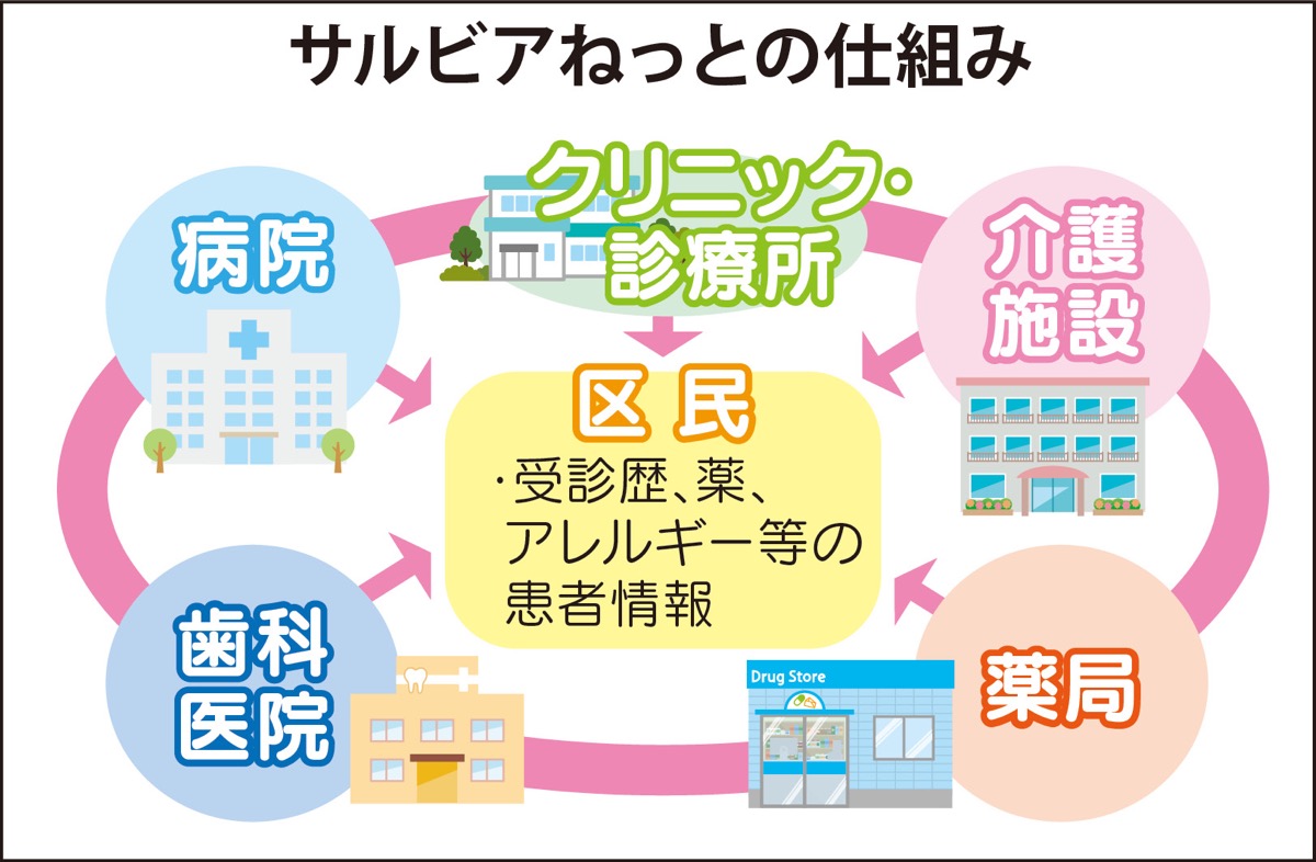 「サルビアねっと」は、情報通信技術(ICT)を活用し、電子カルテ情報や薬の処方歴、検査結果などを共有するネットワークシステム。患者一人に対し、医師や福祉関連などの多職種が包括的に連携しながら見守ることを可能にする。