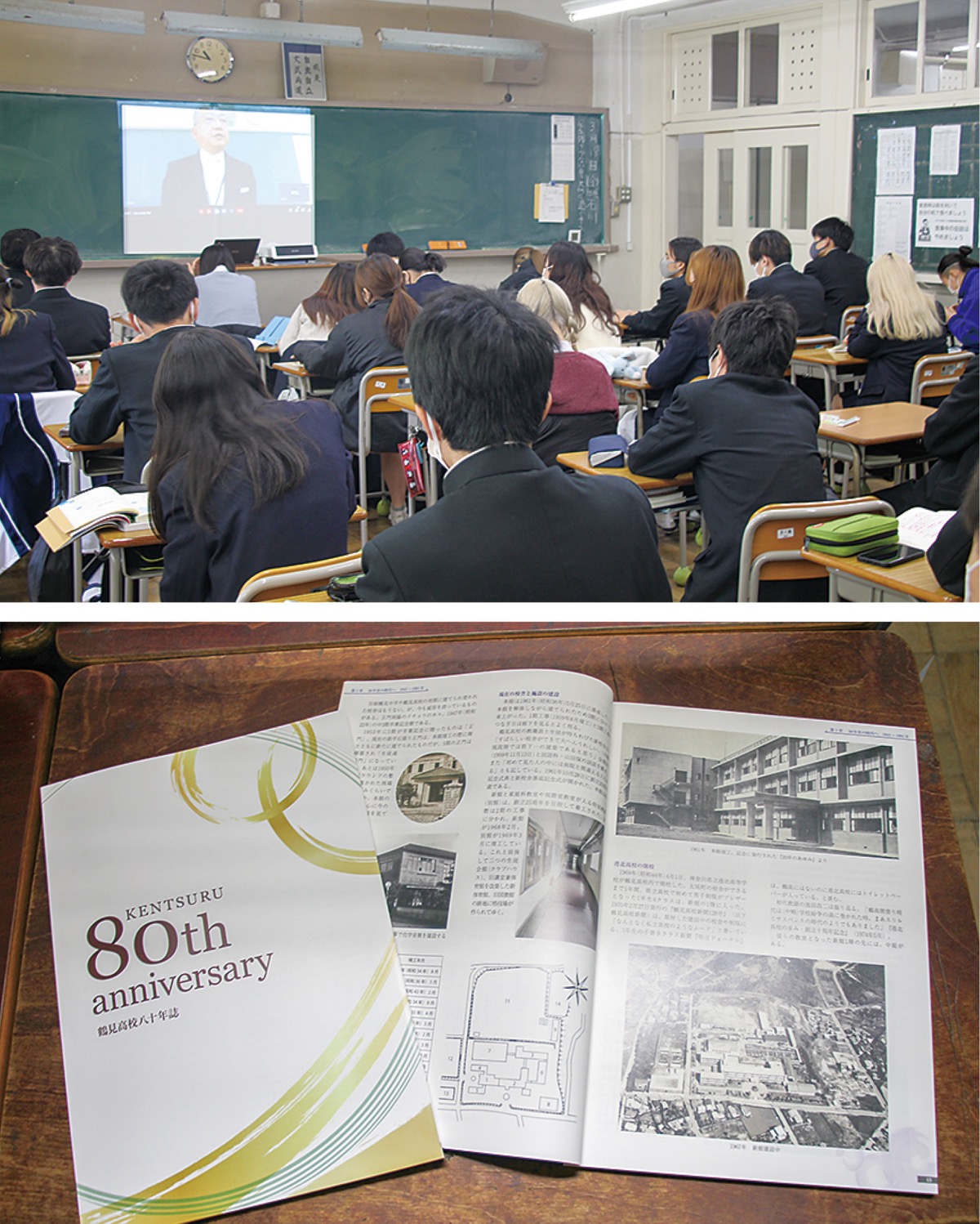 式典当日は、コロナ禍のため、リモートで各教室へ配信。学校の歴史や校歌が流され、生徒は気持ちを一つにした。記念事業として、校内の黒板20カ所が張り替えられたほか、無線LANの整備なども行われた。登壇した戸井田洋校長は「これまでの自分を大切に、新しい自分を創造してほしい」と生徒らへエール。生徒会長の笹原唯さんは「先人たちの”今”が積み重なり今がある。80年の時を思い起こし、これからの鶴見高校の発展を祈ります」と述べた。