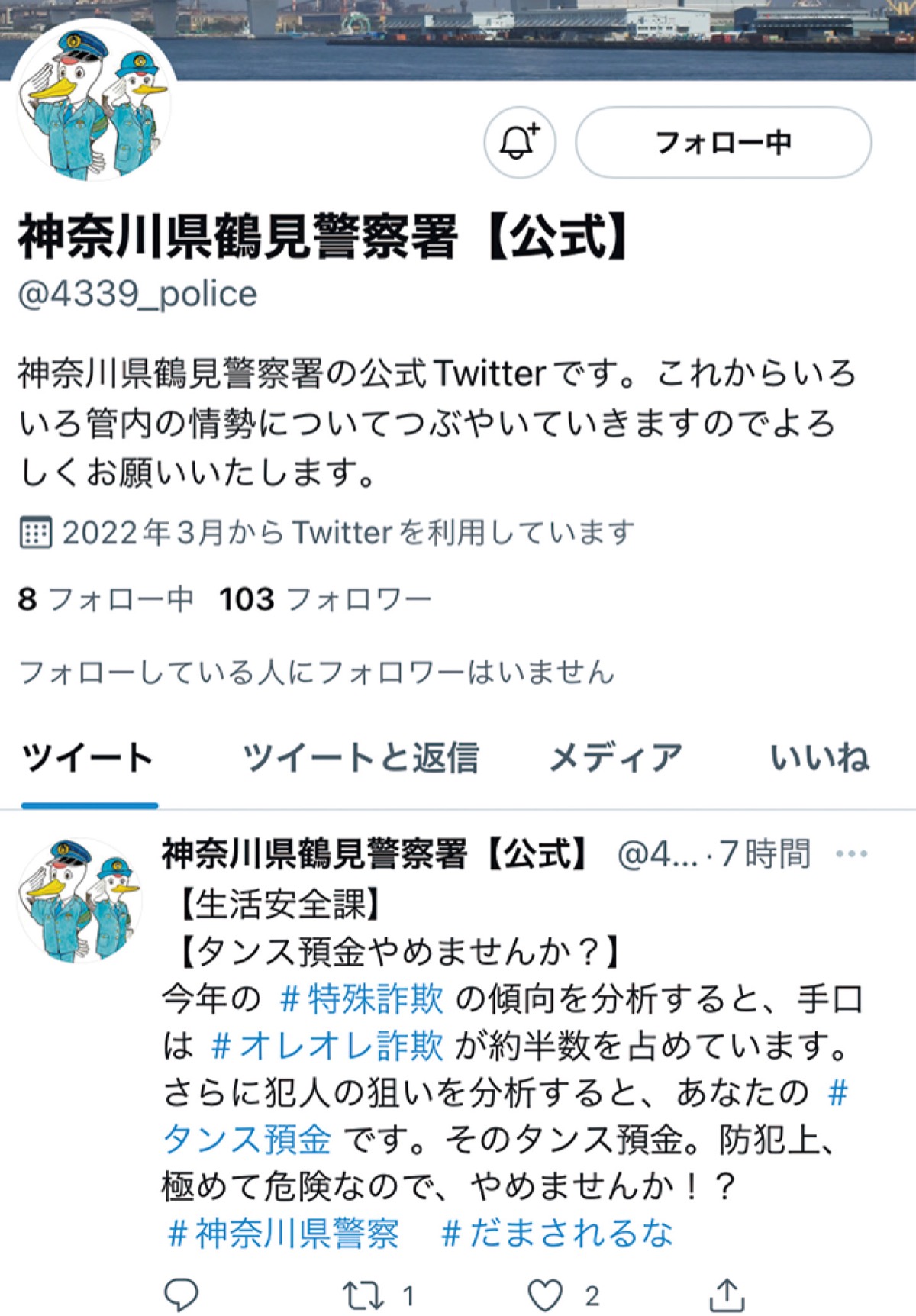 鶴見区内では振り込め詐欺など特殊詐欺の被害が深刻だ。生活安全課は「ツイッターでの啓発も活用しながら被害を食い止めたい」と意気込む。