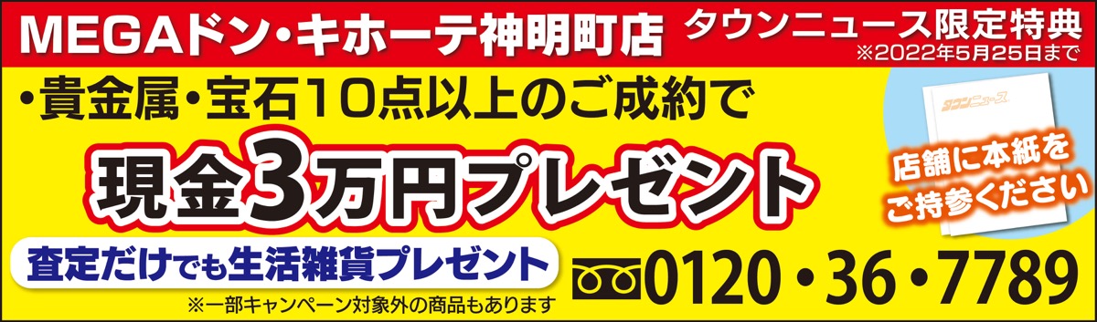国道1号線沿いのディスカウントストア「MEGAドン・キホーテかわさき店」1階にある買取専門店「おたからや」。5月は貴金属・宝石の買取強化キャンペーンを実施中。10点以上の成約で現金進呈の特典があり、スタッフは「昔使っていたアクセサリー、指輪からはずれた宝石など、他店で断られた品もぜひご相談ください」と話す。