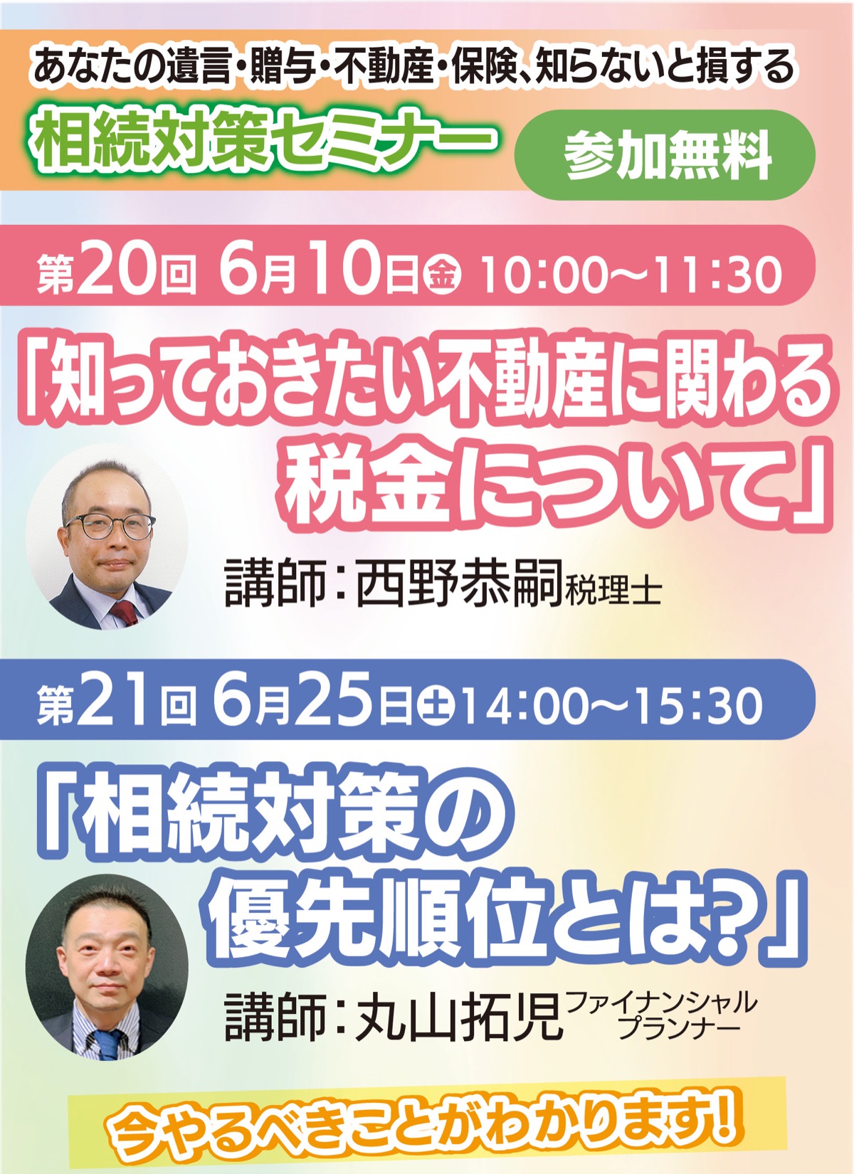 10日は税理士の西野恭嗣氏が「知っておきたい不動産に関わる税金について」というテーマで解説。そして、25日にはファイナンシャルプランナーの丸山拓児氏が「相続対策の優先順位とは?」について語る。