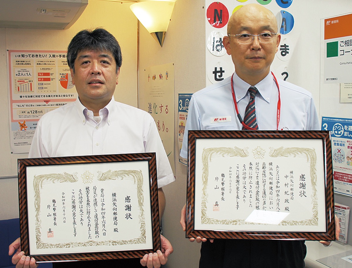 鶴見警察署は振り込め詐欺を未然に防いだとして6月16日、横浜矢向郵便局へ感謝状を贈った。表彰を受けたのは、同郵便局の諸井宏幸局長と、中村紀政さん。