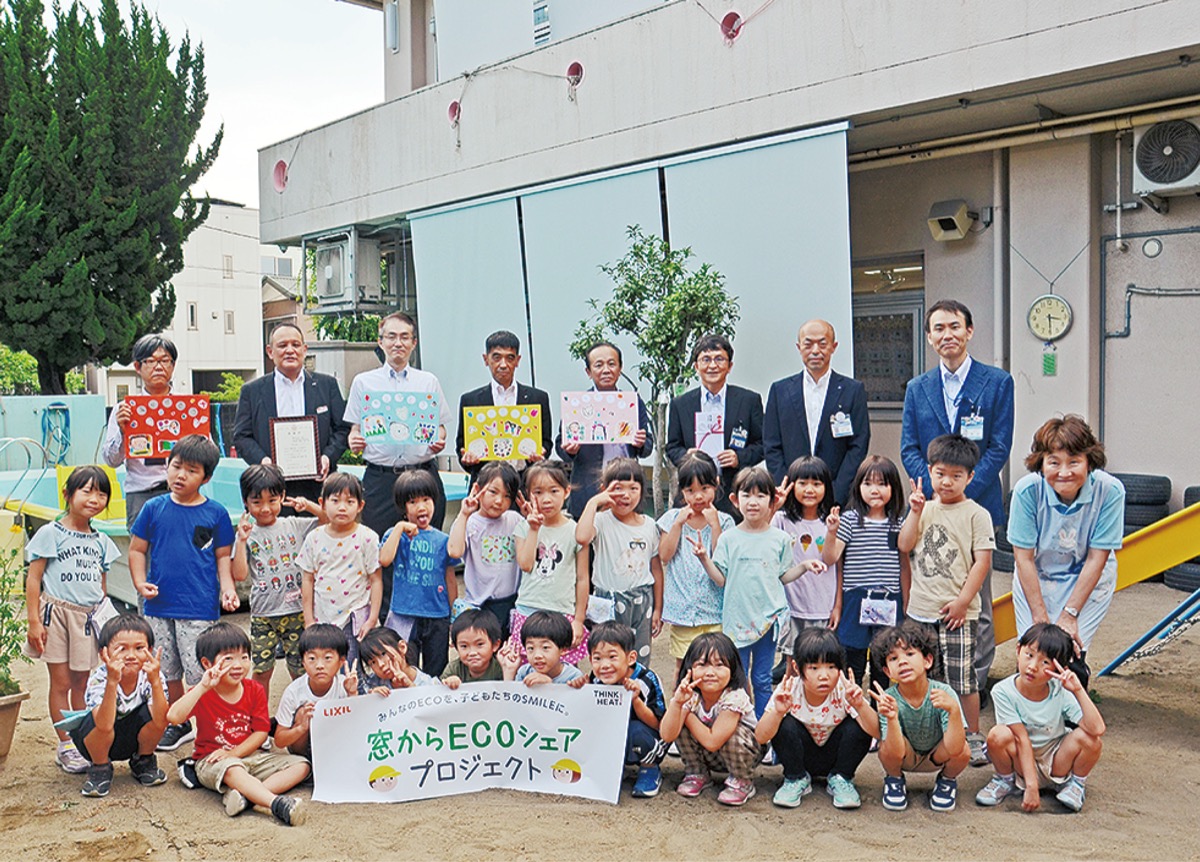 潮田保育園で6月27日、園児たちの熱中症対策にと(株)LIXILからスタイルシェードの贈呈が行われた。園児も参加する中、同社神奈川支社の田島清志支社長や渋谷治雄区長ら多数の出席があった。