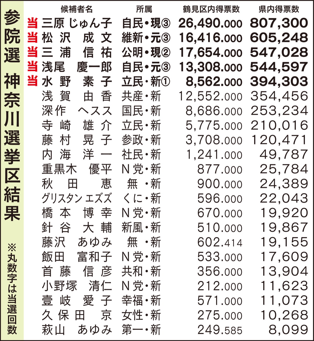 参議院議員選挙の投開票が7月10日に行われた。改選4と欠員補充1の計5議席を過去最多の22人で争った神奈川選挙区は、自民党の現職・三原じゅん子氏(57)が約80万7千票を獲得し、トップ当選。以下、日本維新の会の元職・松沢成文氏(64)、公明党の現職・三浦信祐氏(47)、自民党の元職・浅尾慶一郎氏(58)、立憲民主党の新人・水野素子氏(52)が当選した。