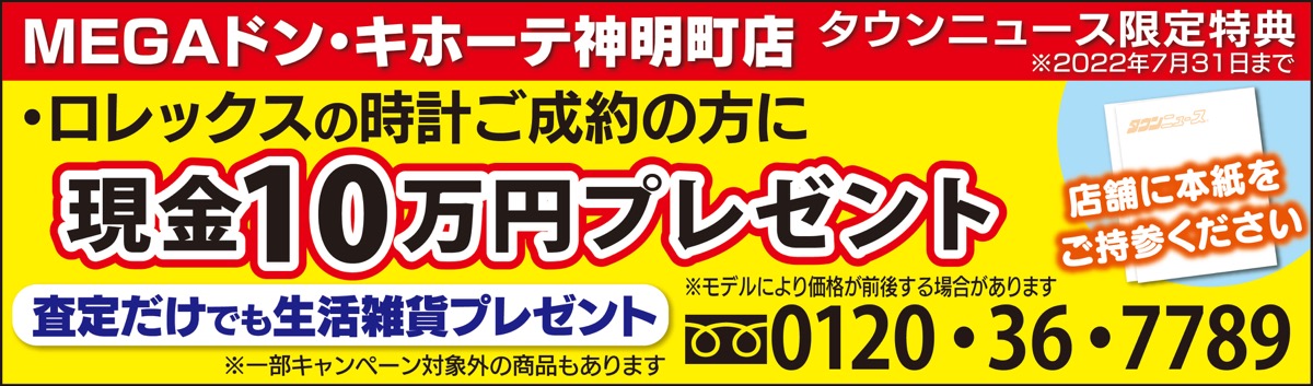 国道1号線沿いのディスカウントストア「MEGAドン・キホーテかわさき店」1階にある買取専門店「おたからや」では現在、「円安還元キャンペーン」を実施中。腕時計・ロレックスの買取成約で、買取料金と別に現金10万円を進呈している。スタッフは「ご好評で多くの相談をいただいています。壊れていても問題ありませんので、この機会にぜひご相談ください」と話す。