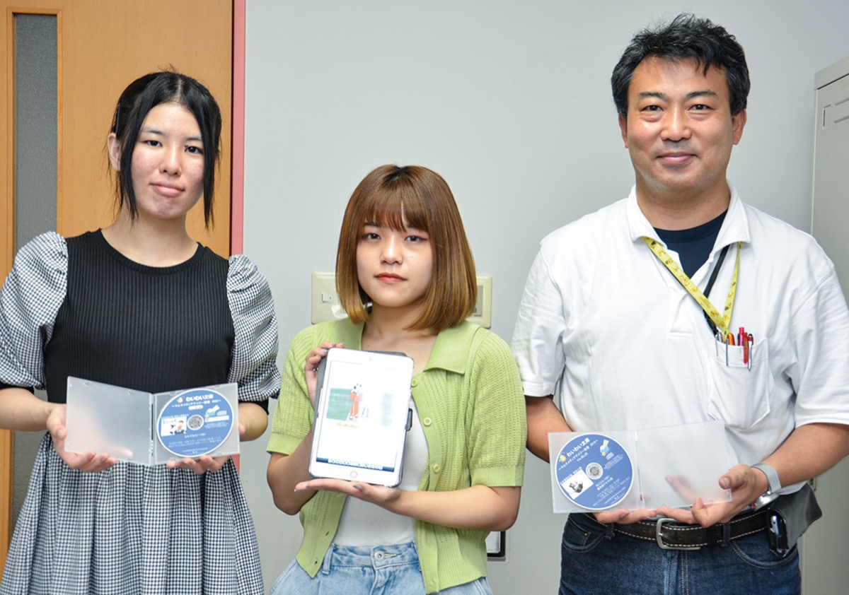 今回は、区内潮田地区に伝わる昔話「とんでもくい」の郷土資料を基に、元木教授がアレンジ。3人の学生と協力して昨年から制作を行ってきた。作画を柳川琴音さん(22)=同左、朗読を金本陽奈さん(20)=同中央=が担当。コロナ禍で集まることが難しく、オンラインでデータを共有しながら、制作作業を続けてきた。「色弱の人でも見やすく、分かりやすい絵を描くことを意識しました」と話す柳川さん。金本さんは「知り合いの子に読み聞かせをしたことはあったけれど、録音は緊張した」と笑顔で話した。