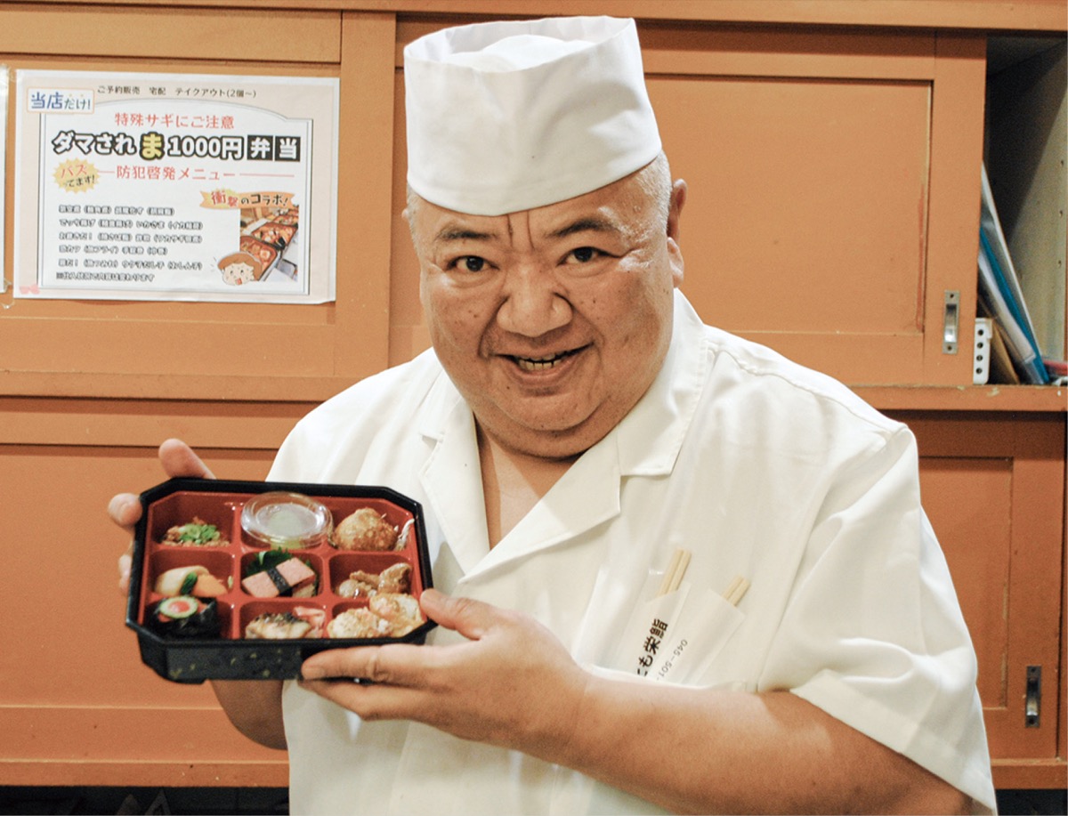 区内で寿司店、とも栄鮨を営む梶朋広さんがこのほど、「ダマされま1000(せん)円弁当」を考案した。