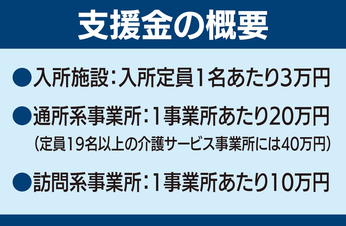 今回の補正予算案では、福祉施設等の光熱費等に対する支援として77億8543万円が計上されています。高齢者施設等、障害福祉施設等の支援額は入所施設では入所定員1名あたり3万円、通所系事業所では20万円(大規模な介護サービス事業所は40万円)、訪問系事業所では10万円となっています。その他にも、児童養護施設等は定員1名あたり2・4万円、救護施設等では定員1名あたり3万円になります。補正予算案は10月14日に開催される県議会本会議で採決される予定です。