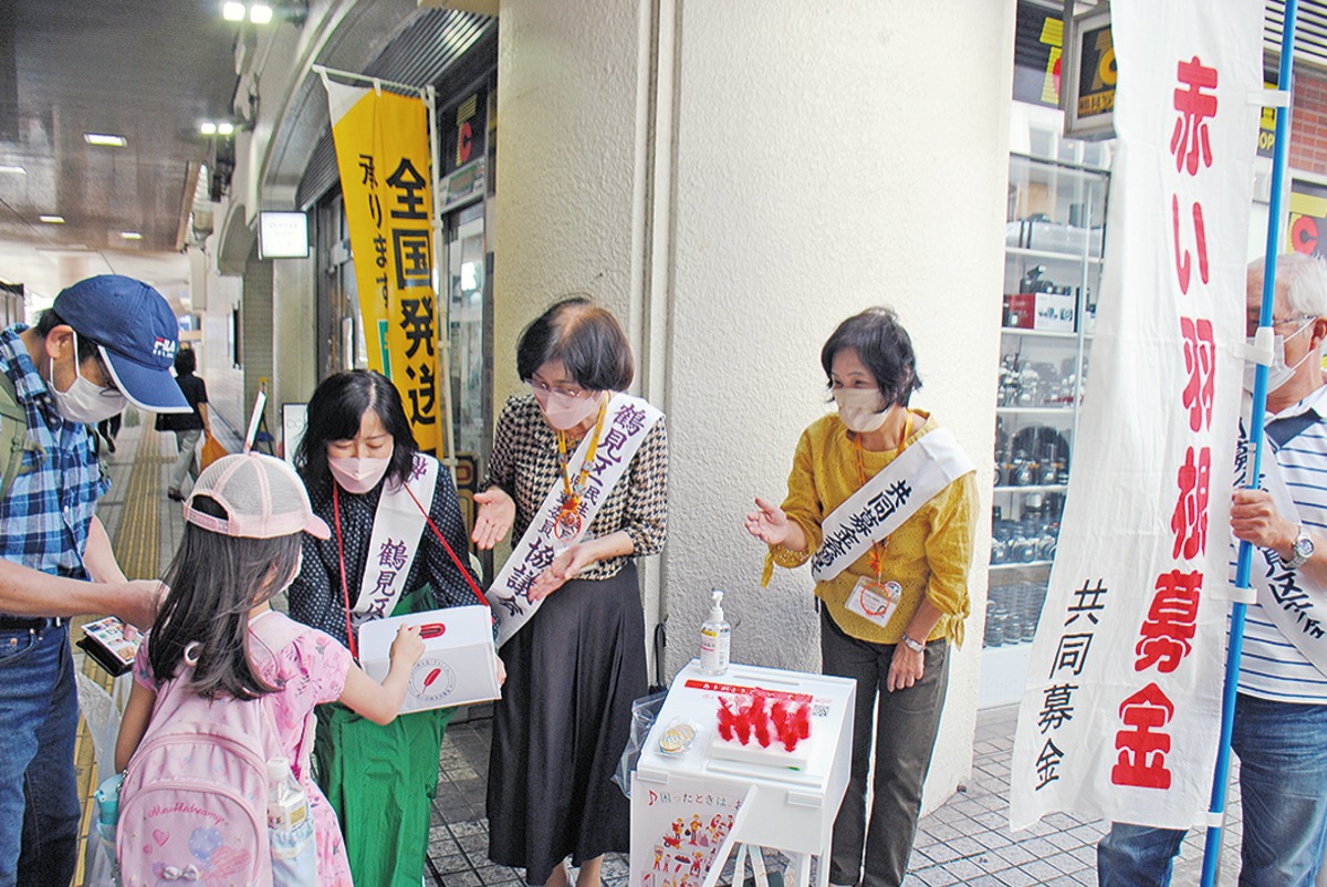 昨年は台風の影響で開くことができず、今回が2年ぶり。今年も新型コロナの影響で活動の規模を縮小。スタッフを区社協と民児協に制限し、56人で運営。また、例年は首から下げていた募金箱は台の上に設置し、呼びかけもスピーカーからの音源のみ、赤い羽根も募金者が自分で取るなど、対策を行った上で寄付を呼びかけた。鶴見駅周辺だけでなく、旧三角交番前や矢向駅でも行われ、1日で計5万4916円が集まった。