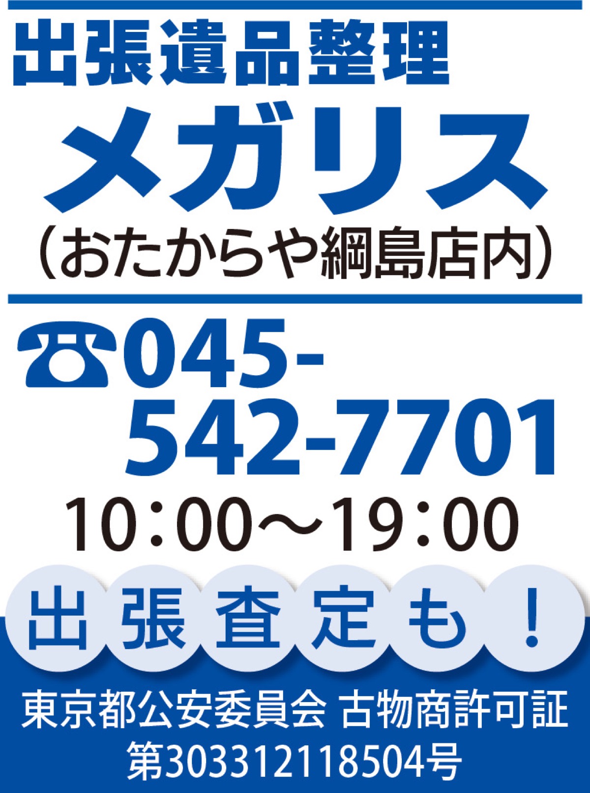 「切れたネックレス」「片方だけのイヤリング」「金歯」「金無垢メガネ」など、使わないものはもちろん、壊れてしまったものでも高額査定の可能性大。「金だけでなく、銀のアクセサリーや置物などもOK。メッキアクセサリーも買取ります」とメガリス(おたからや綱島店)高田代表。同店では、その場で説明しながら鑑定してくれるので「素早く・納得のいく査定」が好評だ。「”光るもの”なら売却のチャンス。気軽に【電話】を」