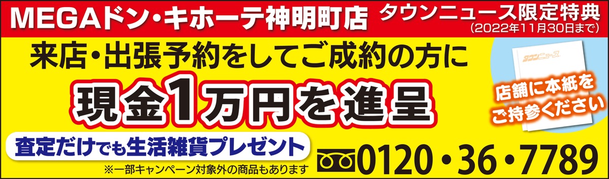 「金・プラチナの価格が過去最高水準となっています。査定だけでも大歓迎ですので、ぜひこの機会にご相談ください」と話すのは、国道1号線沿いのディスカウントストア「MEGAドン・キホーテかわさき店」1階にある買取専門店「おたからや」のスタッフ。同店は11月末まで来店・出張予約後の買取成約で、買取金額と別に現金1万円を進呈中。店頭での査定はもちろん、自宅などへの出張査定にも無料で対応している。