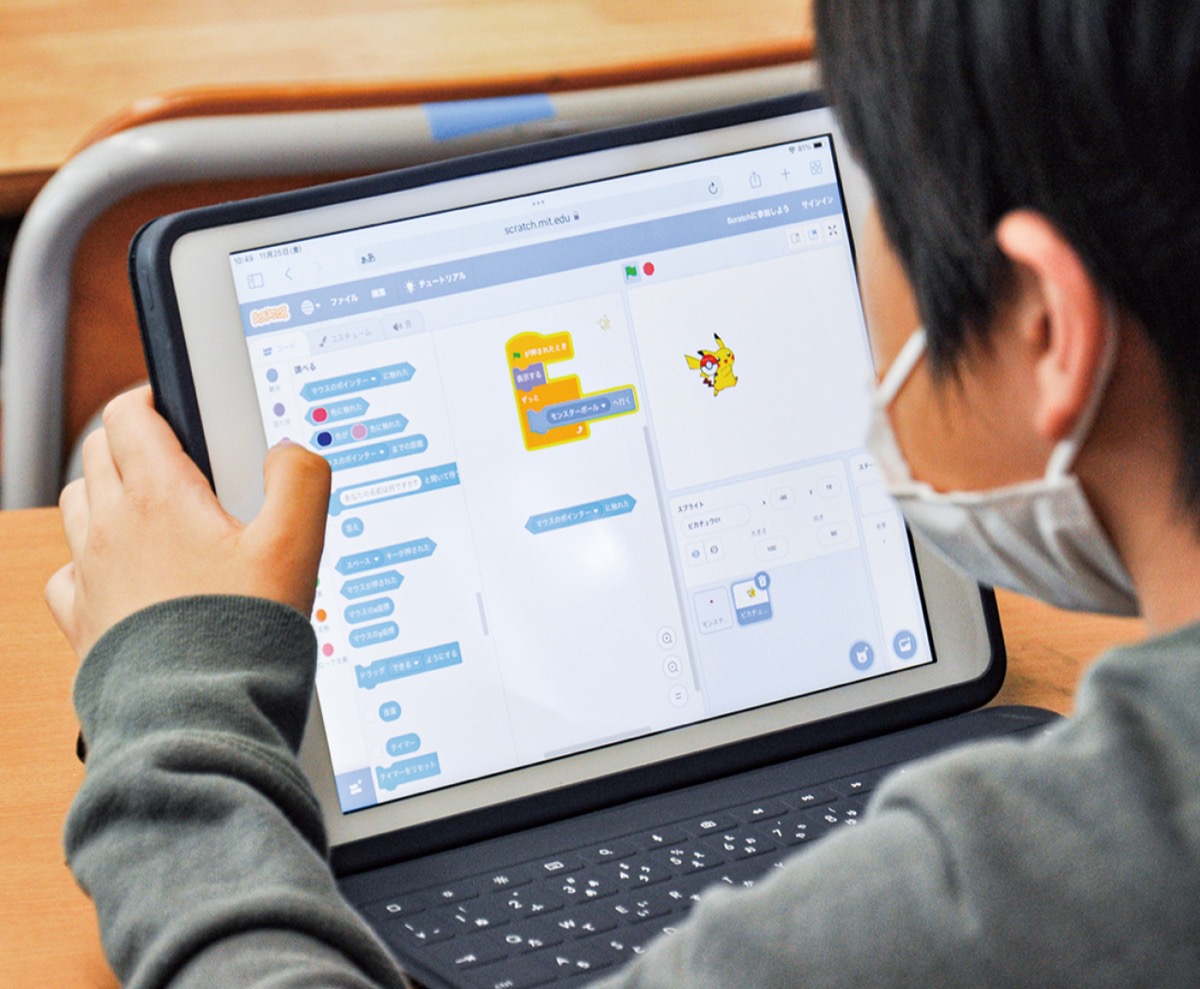当日は山中竹春市長も視察に訪れる中、3年1組の児童がタブレット端末を操作し、動くポケモンをモンスターボールで「ゲット」するゲーム作りに挑戦。ブロックの組み合わせでプログラミングができる「Scratch」を使い、出現するポケモンの数を変えたり、背景や効果音をつけながら自分だけのゲーム作りを楽しんだ。