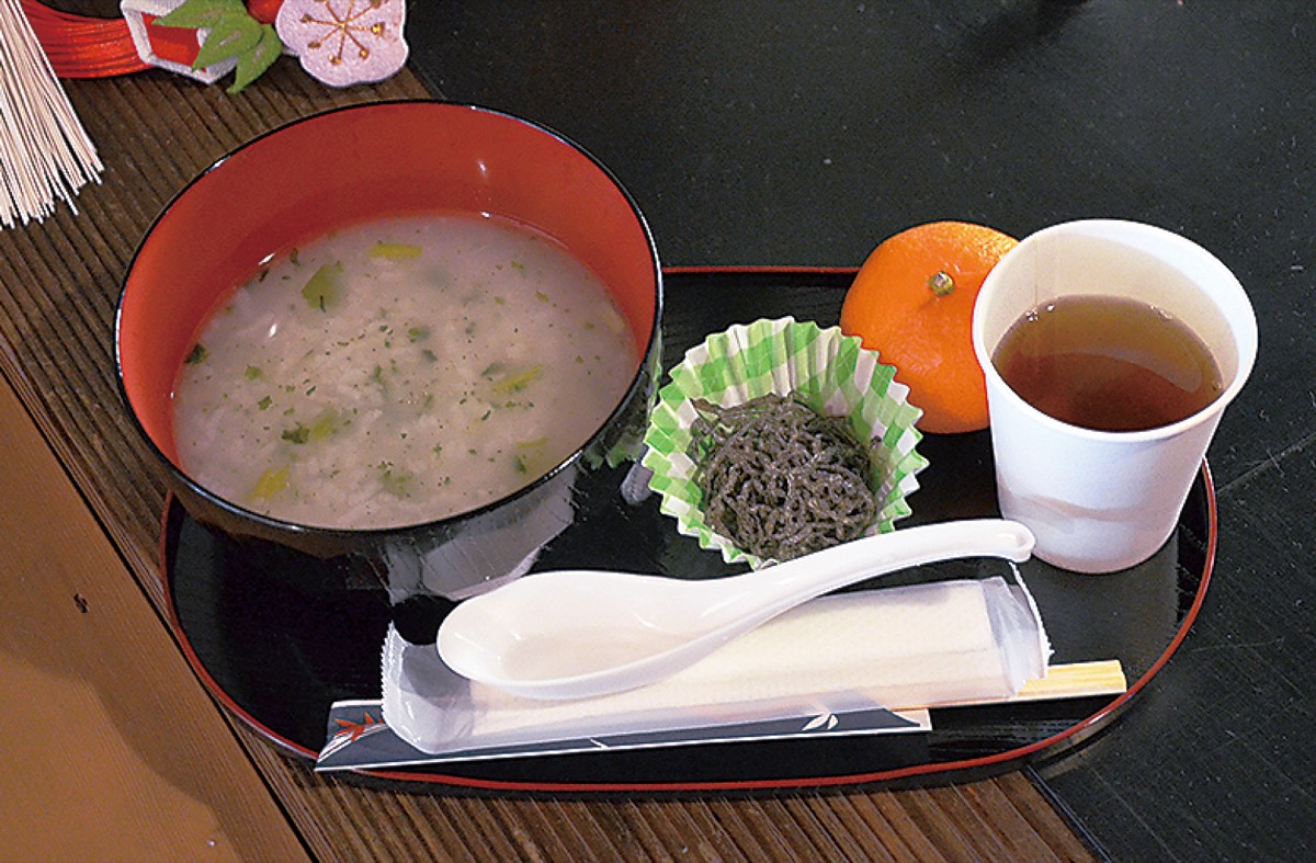 同園での企画は今年で4年目となり、参加者も増えているという。当日は20人ほどが訪れ同住宅内座敷で七草粥を味わった。