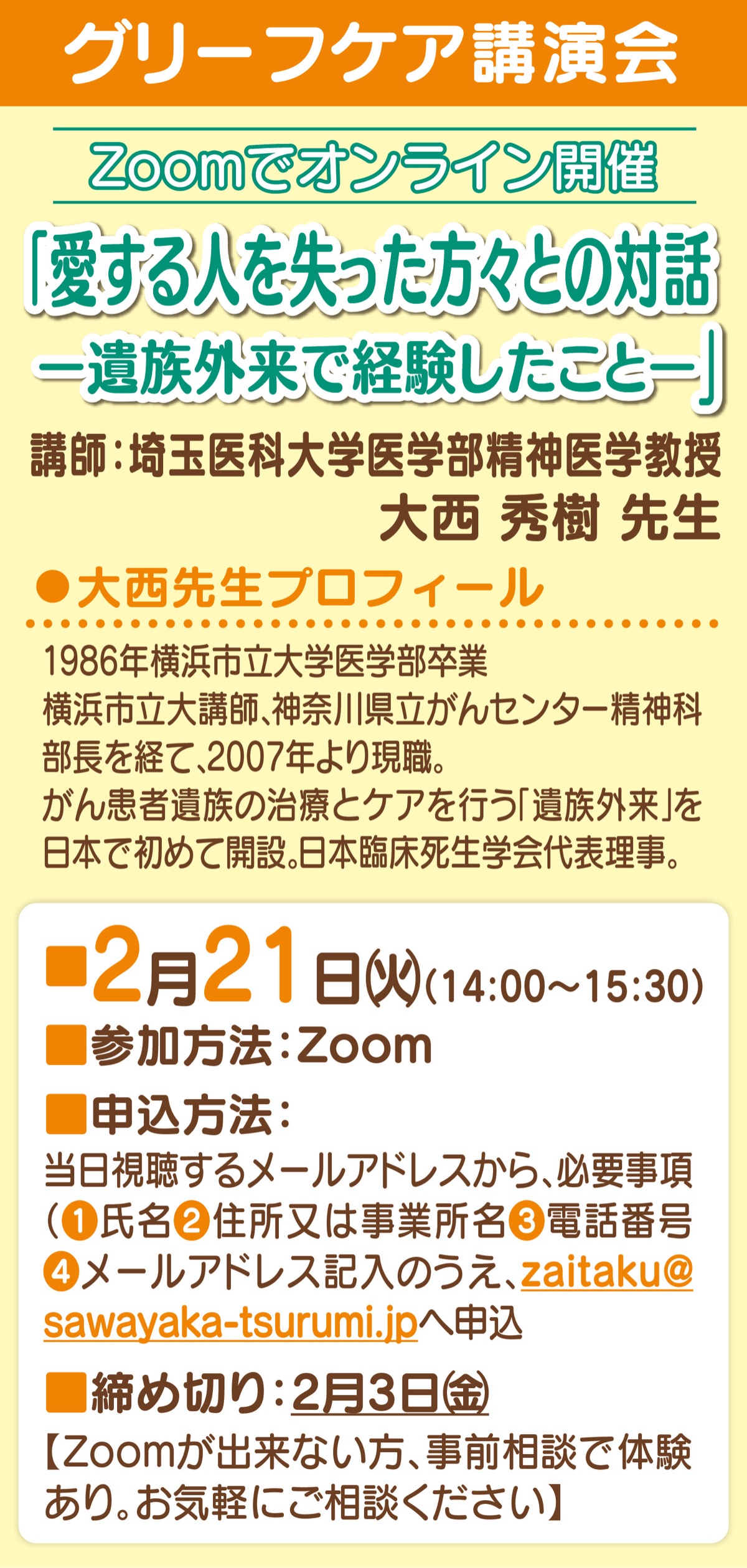 大切な人を亡くした喪失感などに寄り添うための「グリーフケア」を学ぶ市民向け無料講演会が2月21日(火)、オンライン会議ツールZoomで開催される。Zoom未経験者には事前体験あり。