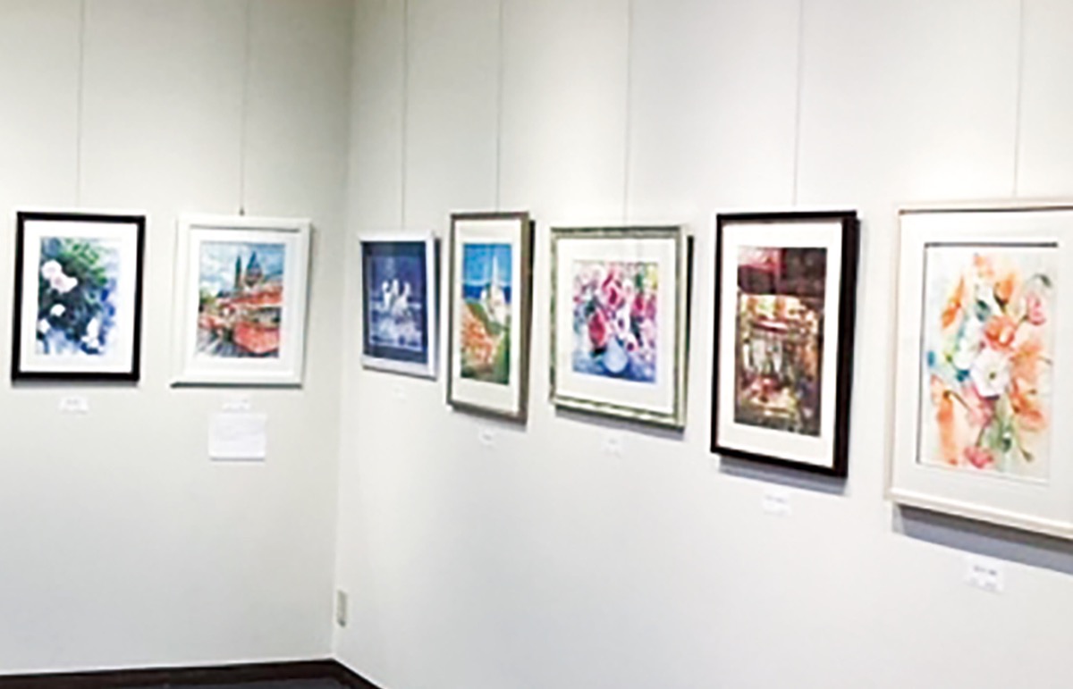 作品のテーマは自由で、バラやダリアなどの花の絵、風景画などが飾られ、すべてが透明水彩絵の具で描かれている。
