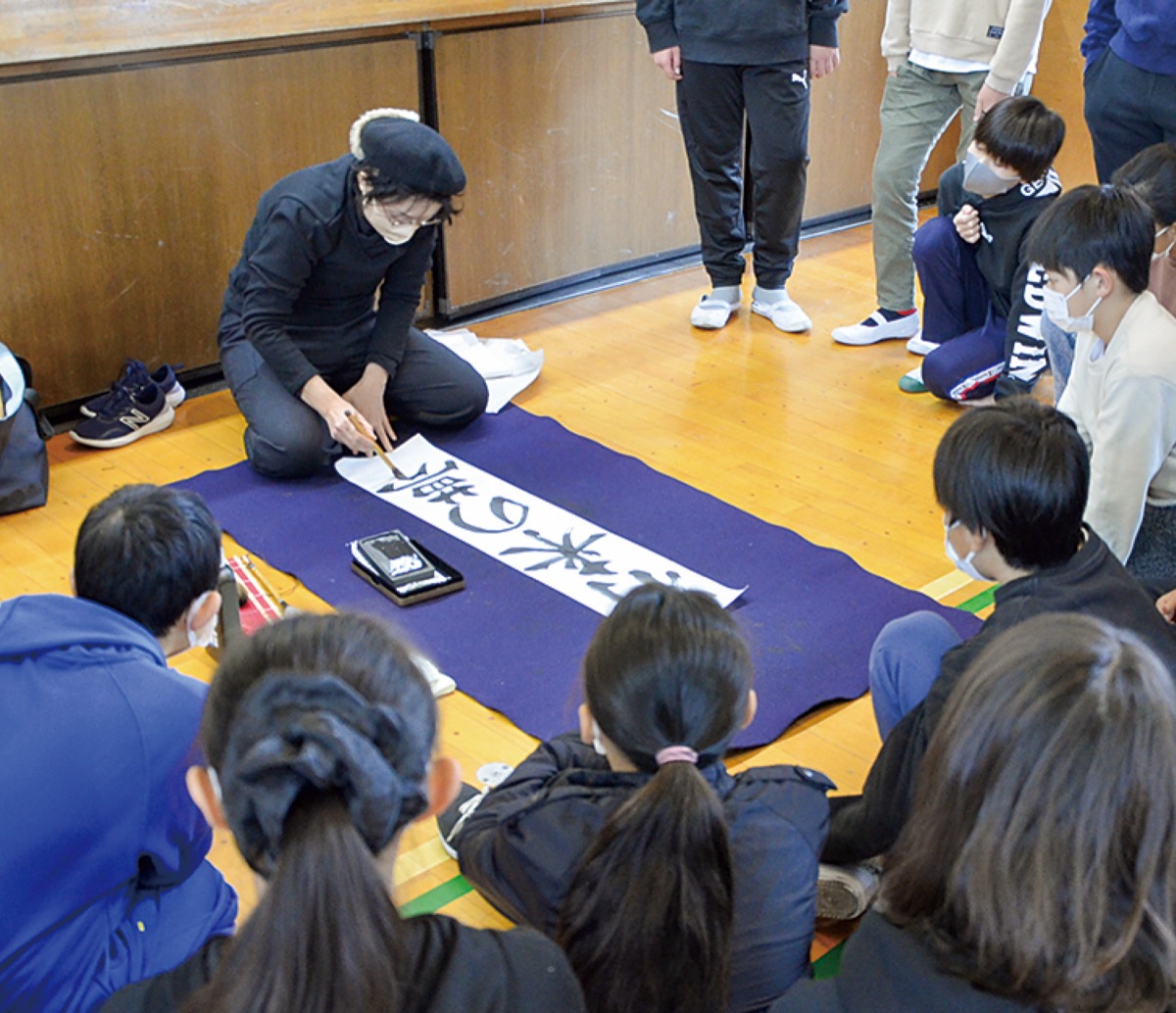 今回児童たちが書いた文字は「将来の夢」。4月から中学生になり、環境が変わることも踏まえ今回のお題となった。初めに永井さんが手本として書を披露し、「大きく書く」「線はまっすぐに」と分かりやすくポイントをまとめて児童に解説。書き初め中は文字のバランスに苦戦する児童や、筆に力がこもり紙を破いてしまう児童も見られた。児童の1人は「難しいけれど楽しい。お手本みたいに綺麗な字を自分も書きたい」と笑顔で話した。