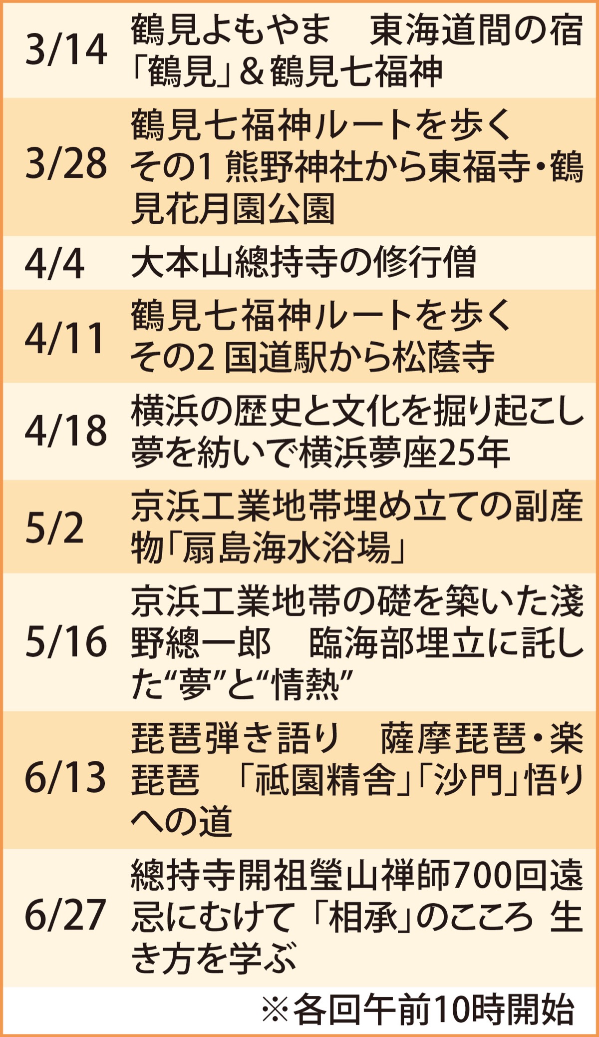 各回の日程や内容は表参照。募集は40人で応募多数抽選。参加費は全9回で4500円(実費が必要な場合は各自負担)。申込みは2月28日までに、往復はがきに講座名、住所、氏名、電話番号、返信先住所、氏名を記載し、〒230-0076鶴見区馬場4の39の1寺尾地区センター寺子屋環塾係へ。問合せは同会齋藤さん【携帯電話】090・3812・4982。