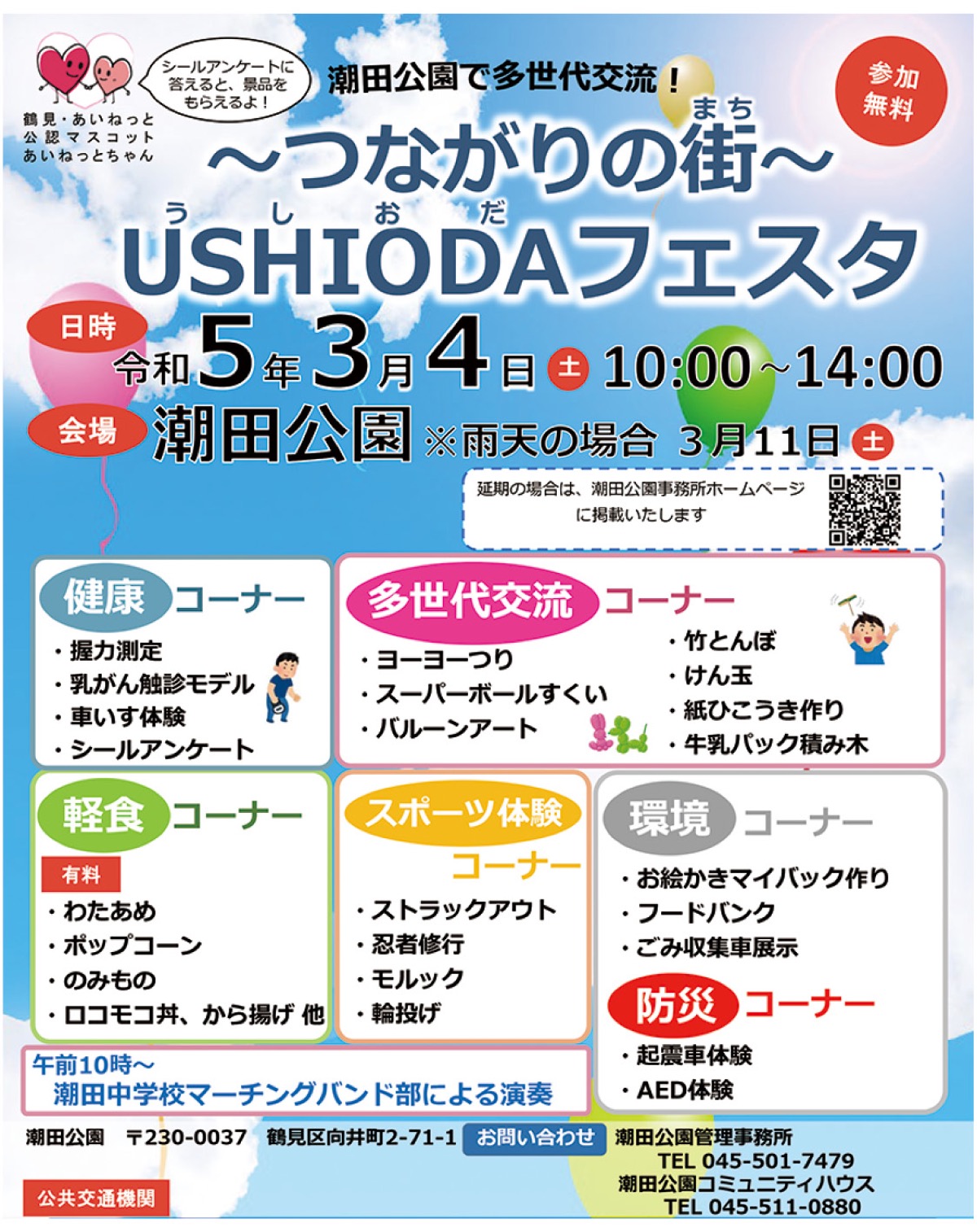 多世代交流を目的とする同イベント。ヨーヨー釣りや竹とんぼなど昔遊びの他、モルックなどのスポーツや起震車体験、車椅子体験などが行われる。午前10時からは潮田中学校マーチングバンドの演奏も。また、回答すると景品がもらえるシールアンケートも実施。