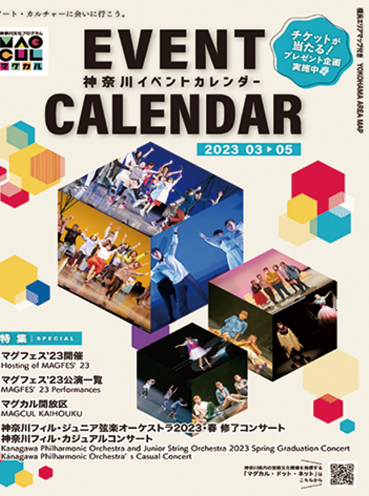 冊子は、県内文化施設の公演や展示情報などを、カレンダー形式で紹介。また、特集記事として、3月末まで開催中の「かながわマグカル演劇フェスティバル2023」や、「マグカル開放区」、「神奈川フィル・ジュニア弦楽オーケストラ2023・春 修了コンサート/神奈川フィル・カジュアルコンサート」の情報を掲載している。