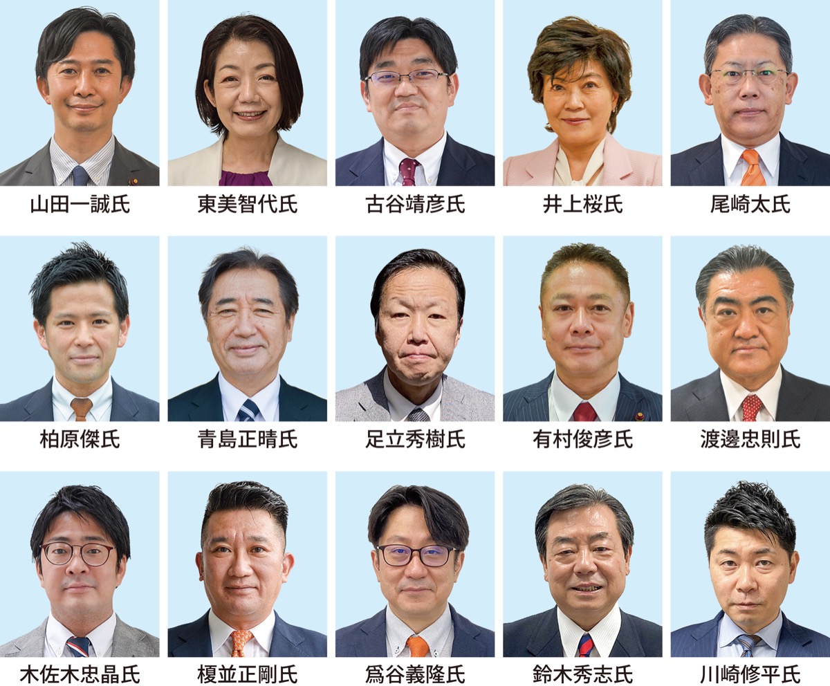 尾崎氏は建設会社勤務などを経て2011年に初当選、3期目。井上氏は大学在学中から市民運動に参加し、95年に初当選、7期目。古谷氏は病院事務次長などを経て11年に初当選、3期目。東氏は女性活躍支援団体代表などを経て19年に初当選、1期目。弁護士の山田氏は父・一海氏を継ぎ19年に初当選、1期目。渡邊氏は証券会社勤務などを経て07年に初当選、4期目。有村氏は建設会社勤務を経て11年に初当選、3期目。足立氏は11年から横浜市議を1期務め、福祉施設で介護職員として働いてきた。青島氏は元小学校教諭で、不登校の子ども支援のNPO理事などを務める。柏原氏は建設会社勤務を経て、現在は少年サッカークラブの代表も務める。