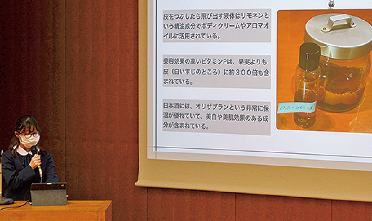 当日は、21人の生徒が3カ所の会場に分かれて発表を行った。発表では、近年問題になっている「食品ロス」の解決に向けてみかんの皮から自作した化粧水を市販のものと比較した生徒や、生麦地域と同校の関わり、昆虫食をテーマとしたものなど、それぞれが幅広い分野で行った研究成果などを語った。