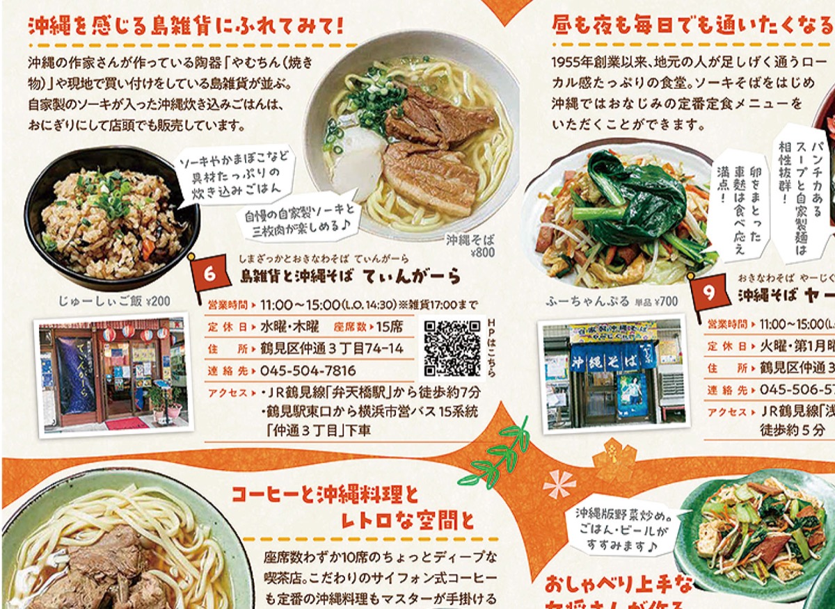 冊子はA4サイズを縦半分にしたサイズで、フルカラー20ページ刷り。JR鶴見駅などからのアクセス方法や、飲食店では沖縄料理店のほかブラジルやペルー、ボリビアなど、同エリアに点在する多国籍料理のお店も紹介している。