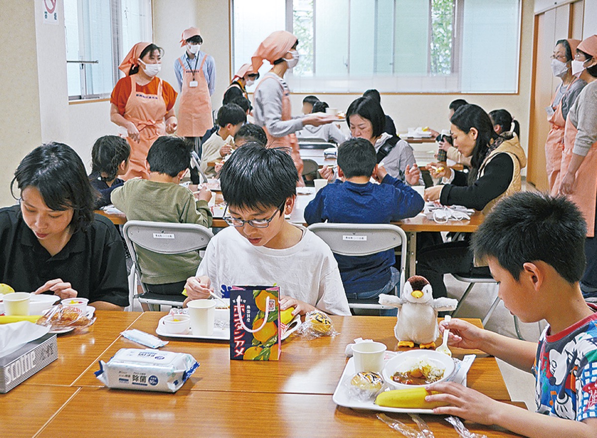 豊岡地区のこども食堂「豊岡もくもぐ食堂」が4月13日、豊岡第二・三会館で初開催された。コロナ前から実施を模索し、豊岡地区連合会婦人部らが実行委を組織して企画したもの。当日は地元有志から米30kgが寄付されるなど多くの人が協力。カレーやデザートが子どもたちに振舞われ、大いに賑わった。