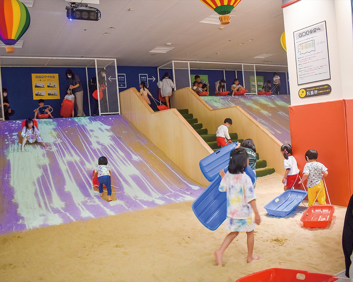 売り場の一角には、約60坪の屋内巨大砂場を設置。高さ3m級で斜度の異なる2つの「巨大砂山すべり台」と「砂場」があり、オープン以来、多くの親子連れで賑わう。料金は平日200円、土日祝300円。抗菌の砂を使っているため、「衛生面も安心して遊ばせられる」という利用者の声もある。